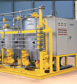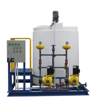 循環(huán)冷卻水加藥系統(tǒng),根據(jù)循環(huán)冷卻水的濃縮倍數(shù),通過電導(dǎo)率儀檢測循環(huán)冷卻的電導(dǎo)率(指標(biāo)為水的含鹽量)達(dá)到一定數(shù)值后,控制電磁閥打開,循環(huán)冷卻水系統(tǒng)開始排放污水,在排放污水的同時(shí)向水中補(bǔ)加新鮮的水,同時(shí)向水中投加緩蝕阻垢劑(其投加濃度根據(jù)水質(zhì)和緩蝕阻垢劑的種類)。由于循環(huán)冷卻水的堿度偏高,可以通過自動(dòng)加酸裝置調(diào)節(jié)其PH值。通過向水中比例投加殺菌滅藻劑,控制循環(huán)冷卻水的細(xì)菌和粘泥的增長。